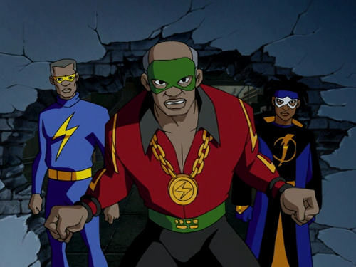 - This episode was originally intended to be a team-up with Black Lightning, but DC would not approve it. [3]Per Dwayne McDuffie, "We did an homage that ended up being quite different."[4]