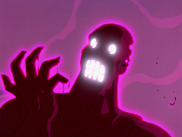 In the meantime, Martin, annoyed by Rudy's very presence, speeds over a bumpy, winding road, ignoring his pleas to slow down. When his car's wheel strikes a rock in the road, the canisters fall over and spill their contents onto Rudy, causing him to scream and mutate into a purple something. Briefly distracted by the sight, Martin nearly hits the arch of a bridge but swerves, sending Rudy falling out of the truck down into a patch of reeds near the river.