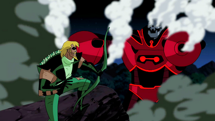 Green Arrow was involuntarily dragged into the mission which involved investigating a radioactive accident in Chong-Mai. The authorities insisted that the incident was under control and the Leaguers depart. Naturally distrustful of authority, Arrow set off to track the root of the problem on his own. He came upon a gigantic flaming creature that blazed everything that crossed its path. Green Arrow attempted to repel it with his explosive arrows, but all in vain. Upon Captain Atom's failure to shut down the behemoth's reactor, Green Arrow attached a containment rod to an arrow, and hit the target with great dexterity.
