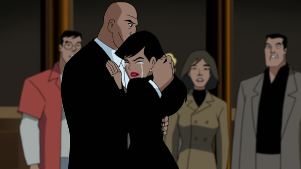 At Superman's funeral, the attendants include the League (minus Batman), the staff of the Daily Planet, Jonathan and Martha Kent, several Earth leaders, and superheroes. However, everyone gasps as Lex Luthor arrives. The infuriated Lois Lane slaps Luthor across his face, as she believes he came to gloat over Superman's death, but she soon breaks into tears and anger until Lex comforts her and genuinely admits that he will also miss Superman greatly. J'onn J'onzz pronounces a eulogy and the League ceremonially inters a coffin in a monument. As they bring the coffin to his memorial, Wonder Woman spots Batman watching the procession from the shadows.