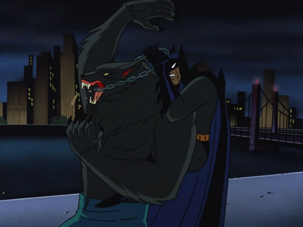 Batman: (Fighting the werewolf) Do me a favor, Shaggy! (Batman starts beating on him with a wooden construction beam) Stay down! (The werewolf breaks the beam) Guess not. |