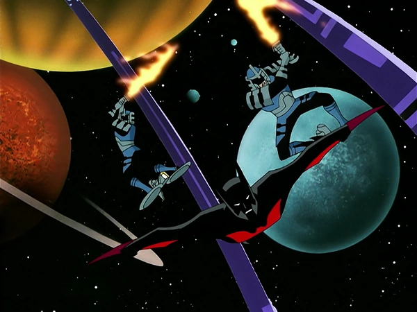 "Sentries of the Last Cosmos" is the twenty-third episode of the second season of Batman Beyond. It depicts the arrival of a trio of teenagers literally enacting the events of a VR game. The top three players of Sentries of the Last Cosmos are called together by Simon Harper, the creator of the game. Convinced that the game is not just a game but reality, they are granted actual flaming swords and flying disks. Believing that they are actually helping out the side of good, they begin sabotaging parts of Gotham. Worst of all, these players are so good that even Batman is hard pressed to stop them.