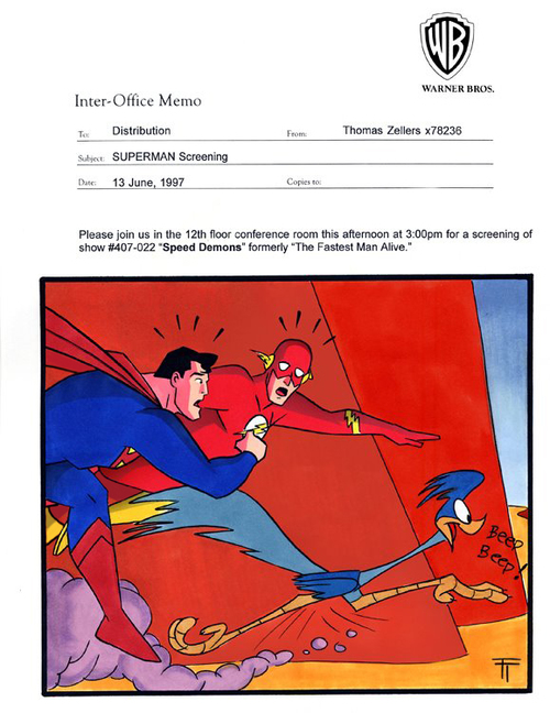 "Speed Demons" is the fourth episode of the second season of Superman: The Animated Series, and the 17th of the overall series. It depicts the first appearance of the Flash in Metropolis. Superman and the Flash are asked to compete in a charity race. However, they soon discover that the race is just a hoax in order for them to generate power for a weather altering machine used by the Weather Wizard. With this machine, he can create any weather anywhere. Superman and the Flash must team up to beat him.