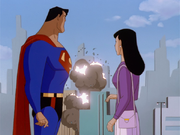 - in part 2 after Superman flew Lois and Batman out of the burning LexCorp factory, despite it being Batman who pushed Superman away (he uses his left elbow to swat Superman's right forearm) the episode's accompanying Described Video incorrectly says "Superman flies with Batman and Lois and touches down across the parking lot across the burning building. He pushes Batman away."