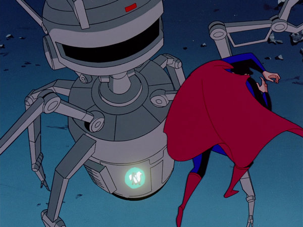 While Batman deals with the wing, Superman is pummelled by the robot until it tries to smash him with a heavy door. The door, which had been lined with lead to block Superman's x-ray vision, protects him from the Kryptonite and he destroys the robot, in the process shattering the last of the Kryptonite to pieces. Superman heads off to help stop the Joker.