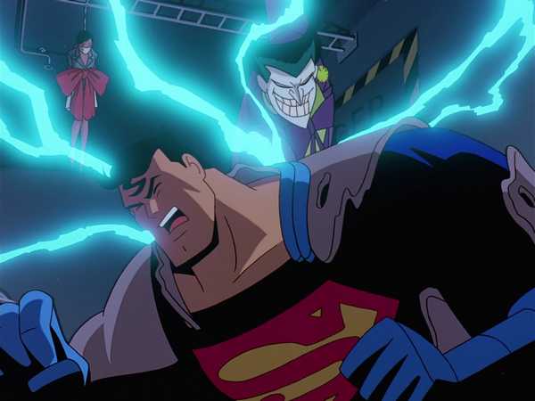 Superman arrives at the laboratory wearing his Anti-Kryptonite suit. Joker appears confused when the Kryptonite has no effect on him, and Superman quickly gets him to lead him to where Lois is. But just as Superman is about to save Lois, Joker uses his acid flower to destroy the suit. Exposed to the radiation, Superman is quickly incapacitated by Joker, and who gleefully celebrates his victory by electrocuting Superman with his buzzer. Before he can kill Superman, however, Harley Quinn calls and warns that Batman has arrived. Joker leaves, and as soon as Batman enters the room, the doors are sealed and Joker Gas is vented in.