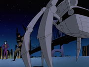 Batman and Superman arrive but are attacked by giant versions of the Wayne/Lex T-7's before they can stop Joker from taking off. Working together, they destroy most of the robots, but then are faced with one that has Mercy strapped to its side as a shield, preventing them from hitting it. Batman manages to get the robot off the ground and Superman deactivates it without hurting Mercy. Mercy tells them of Joker's plans, which Superman realizes means destroying half of Metropolis, resulting is mass casualties. The group is confronted by a larger, more advanced robot. Superman tells Batman to go after Joker while he takes care of the robot. Unfortunately, this one is equipped with the other half of the Laughing Dragon, rendering Superman unable to fight back.